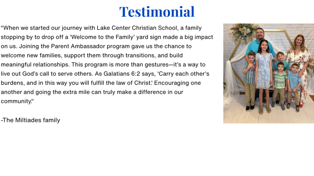 As a new family at Lake Center Christian School, you are warmly welcomed through our Parent Ambassador Program. You’ll be paired with an LCCS parent whose children attend the school, giving you a friendly guide from day one.